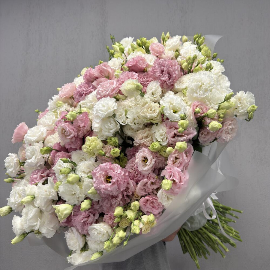 На фото букет из 101 эустомы розового и белого цвета. В составе: эустома (лизиантус) 101 шт, дизайнерская упаковка 5 шт, атласная лента 1 шт, . Все цветы свежие и ароматные, букет красиво оформлен и отлично подходит для подарка. Доступна доставка цветов или самовывоз.
