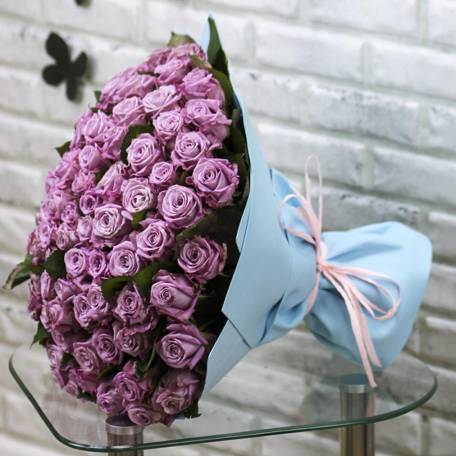 На фото букет из 101 фиолетовой розы. В составе: роза 101 шт, фоамиран 2 шт, атласная лента 1 шт, . Все цветы свежие и ароматные, букет красиво оформлен и отлично подходит для подарка. Доступна доставка цветов или самовывоз.