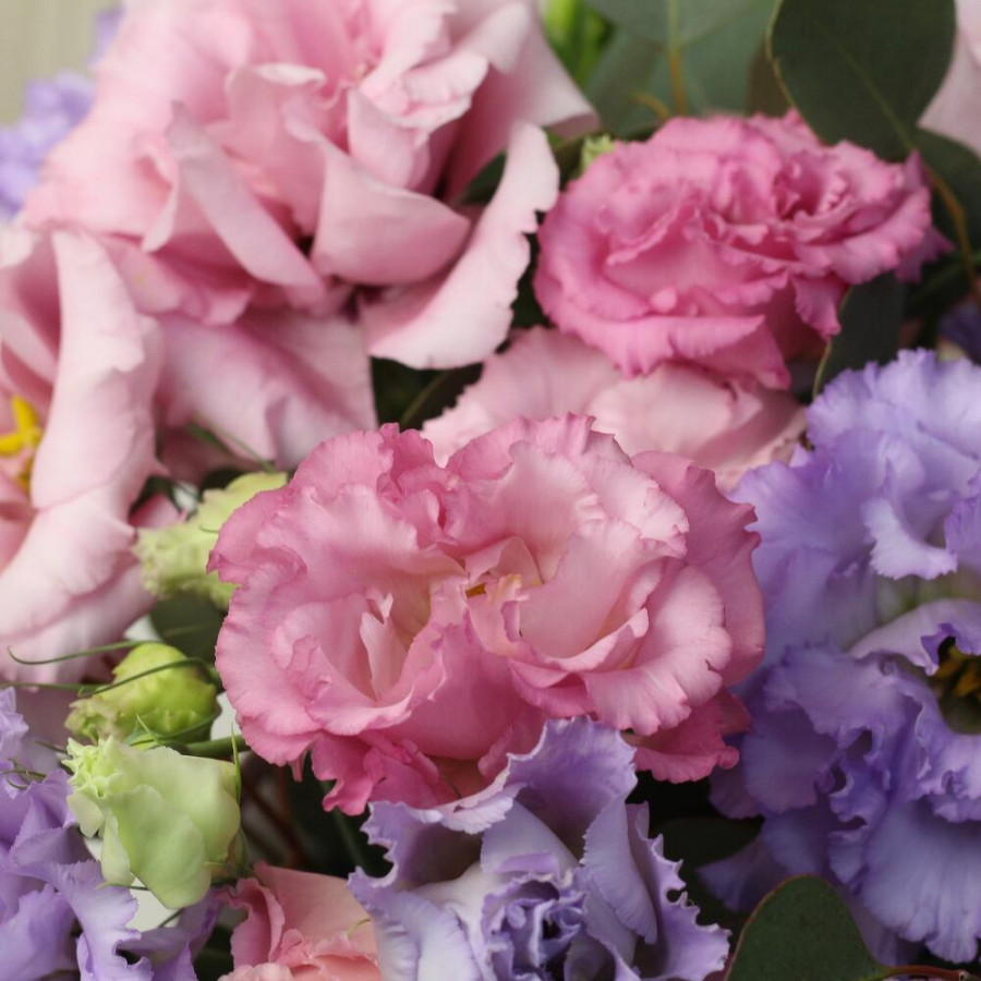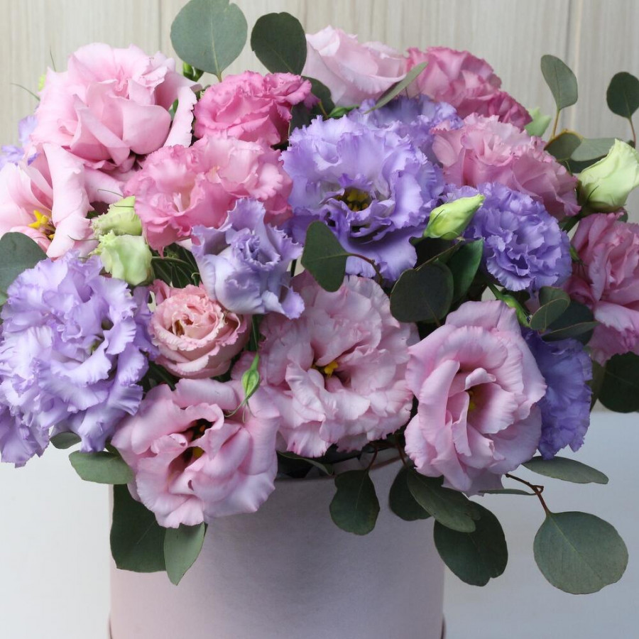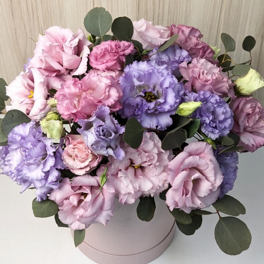 Букет из 15 розовых и сиреневых эустом в коробке в Бежецке