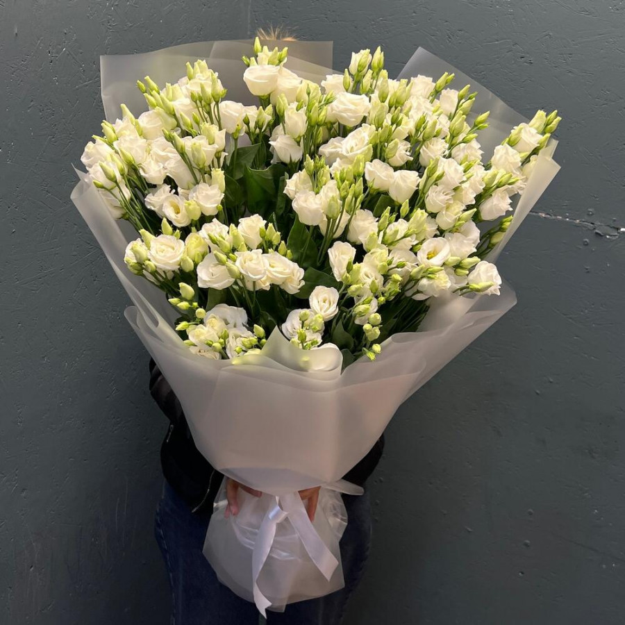 На фото монобукет из 21 белой эустомы. В составе: эустома (лизиантус) 21 шт, дизайнерская упаковка 2 шт, атласная лента 1 шт, . Все цветы свежие и ароматные, букет красиво оформлен и отлично подходит для подарка. Доступна доставка цветов или самовывоз.