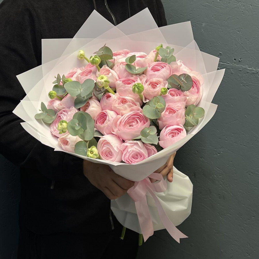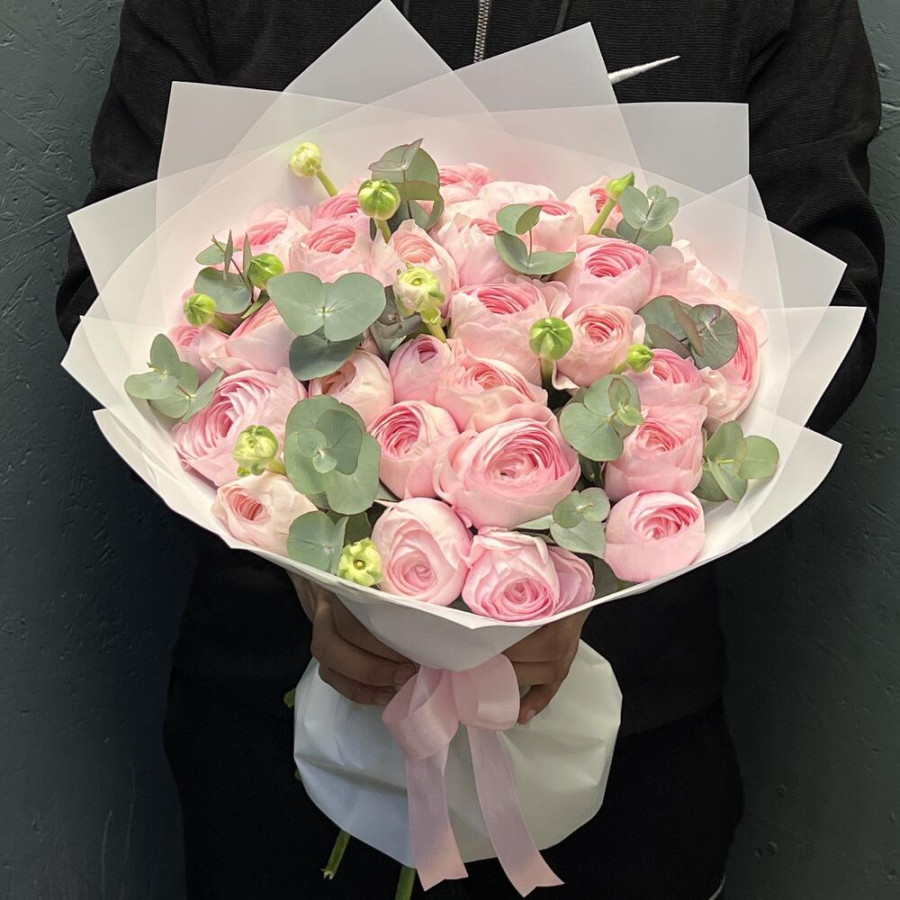 Букет из 29 розовых ранункулюсов с эвкалиптом в Бежецке