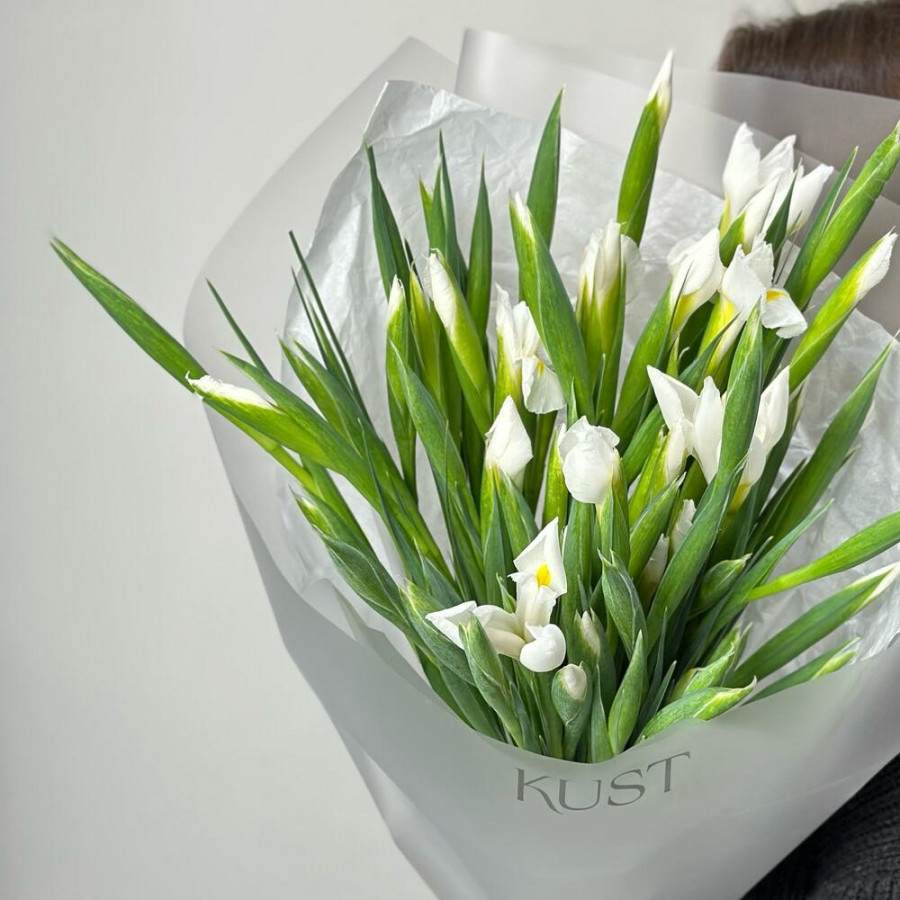На фото нежный букет из 49 белых ирисов. В составе: ирис 49 шт, дизайнерская упаковка 2 шт, атласная лента 1 шт, . Все цветы свежие и ароматные, букет красиво оформлен и отлично подходит для подарка. Доступна доставка цветов или самовывоз.