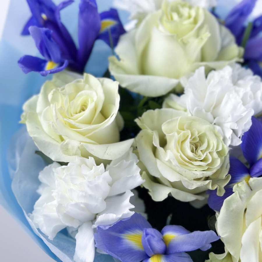 Букет из белых гвоздик, синих ирисов и белых роз фото 4