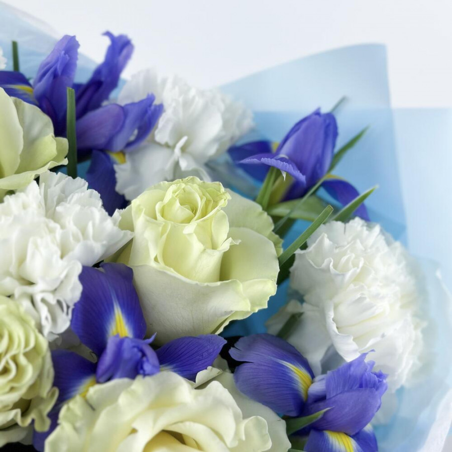 Букет из белых гвоздик, синих ирисов и белых роз фото 3
