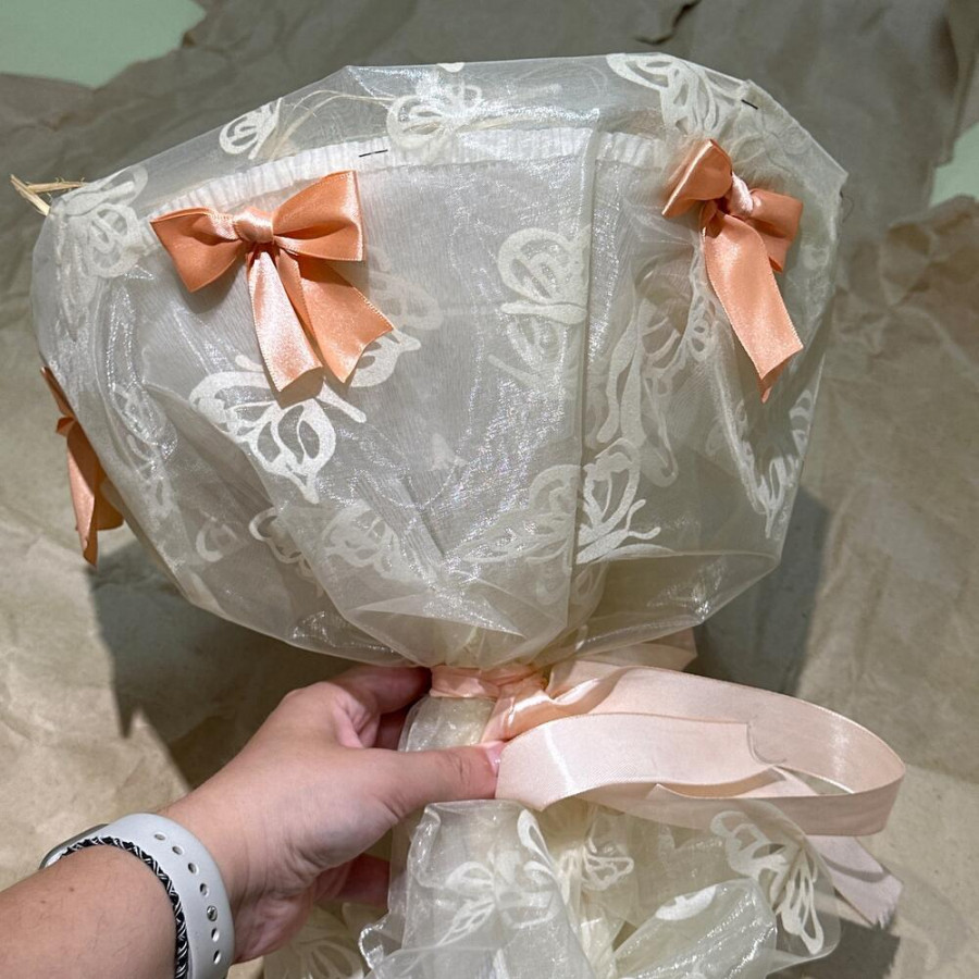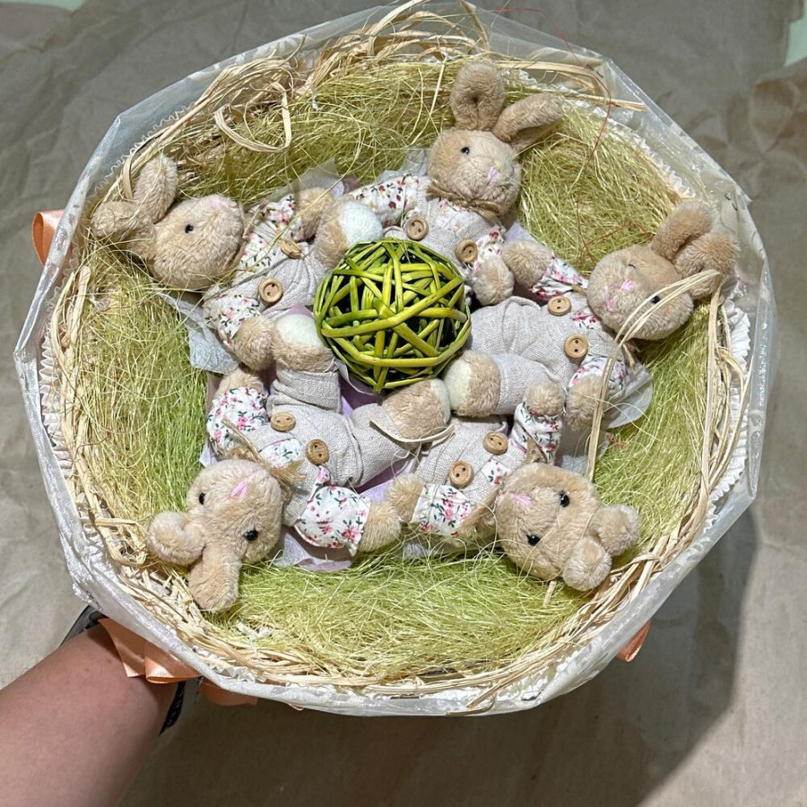 На фото букет из игрушек зайчат в платье. В составе: . Все цветы свежие и ароматные, букет красиво оформлен и отлично подходит для подарка. Доступна доставка цветов или самовывоз.