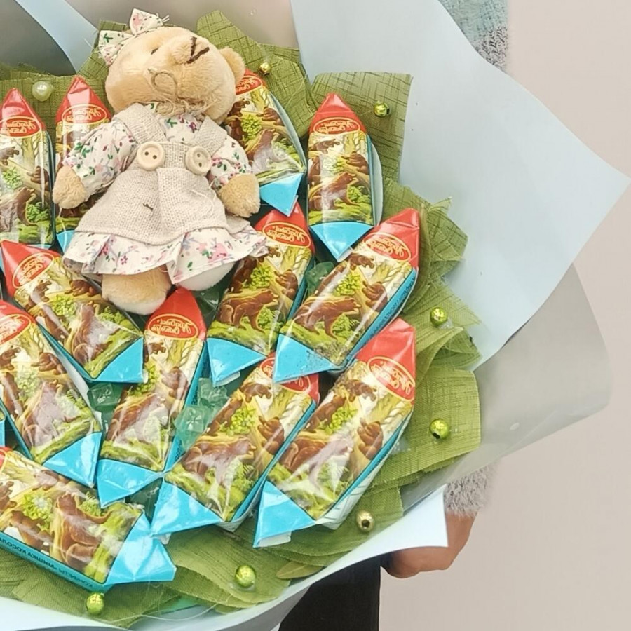 Лента атласная - 1 шт. Упаковка дизайнерская - 2 шт. Мишка плюшевый - 1 шт. бусинки - 25 шт. конфеты мишка косолапый - 14 шт.