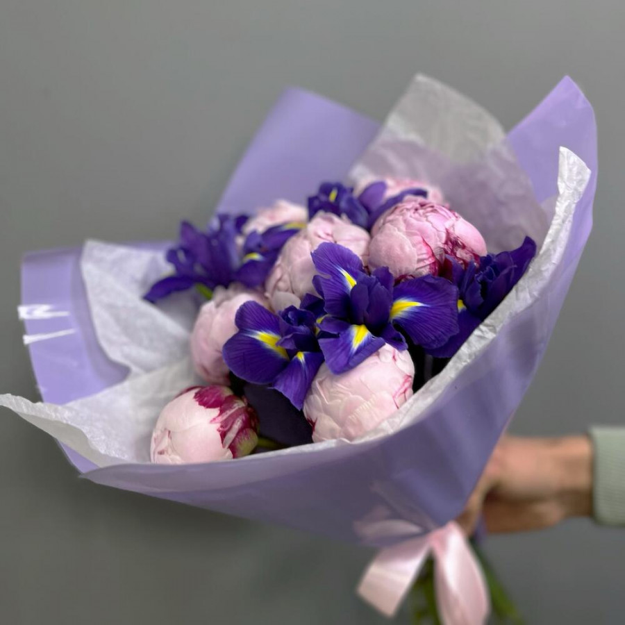 На фото букет из розовых пионов и ирисов. В составе: пион 7 шт, ирис 5 шт, дизайнерская упаковка 1 шт, атласная лента 1 шт, . Все цветы свежие и ароматные, букет красиво оформлен и отлично подходит для подарка. Доступна доставка цветов или самовывоз.