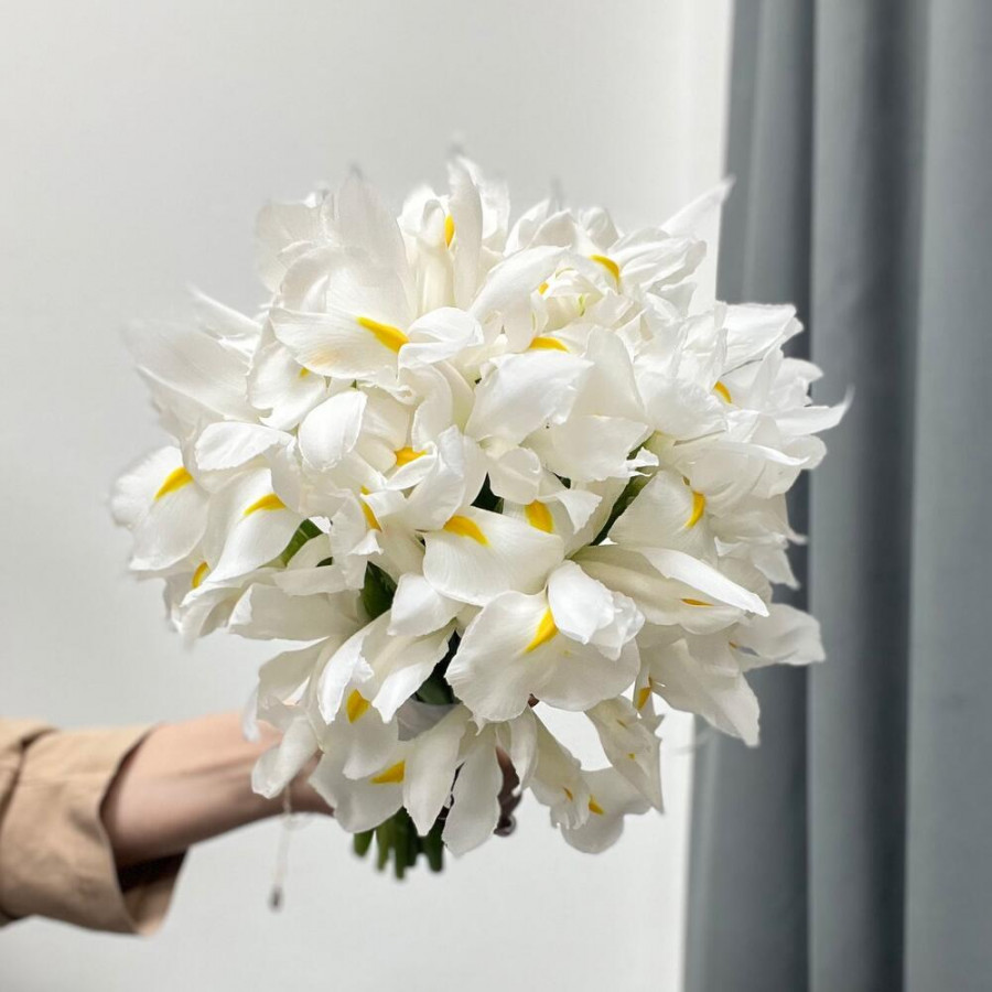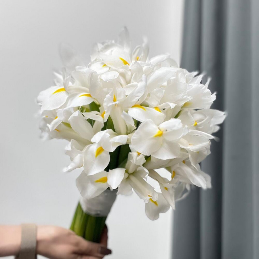 На фото букет невесты из белых ирисов. В составе: ирис 25 шт, атласная лента 3 шт, . Все цветы свежие и ароматные, букет красиво оформлен и отлично подходит для подарка. Доступна доставка цветов или самовывоз.