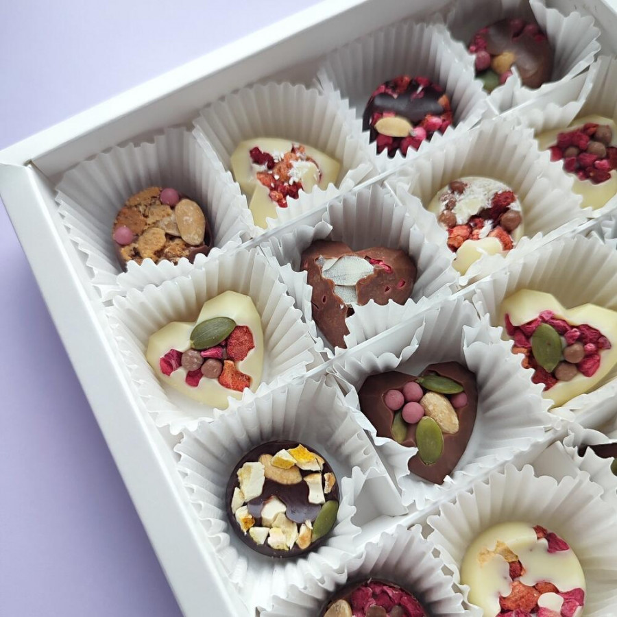 Состав : шоколад темный итальянский IRCA 48% , шоколад молочный Cargil 34%, шоколад белый 29% Cargil , сублимированная малина, клубника, абрикос, лимон, орех кешью, орех кокосовый стружка, орех арахис, орех миндаль, шоколадные шарики Callebaut клубничные, шоколадные шарики молочные, вафельная крошка, тыквенные семечки.