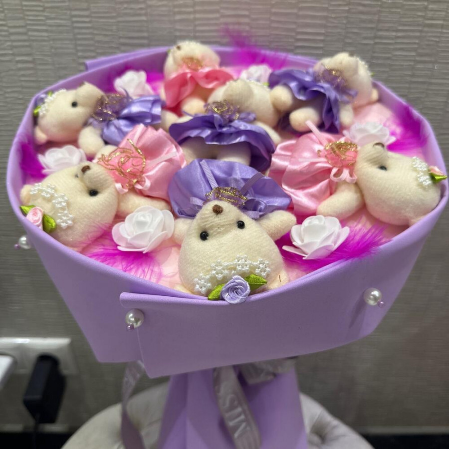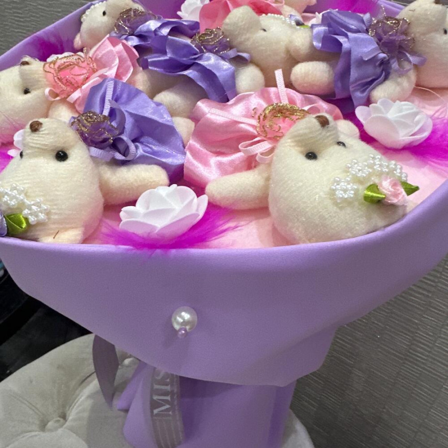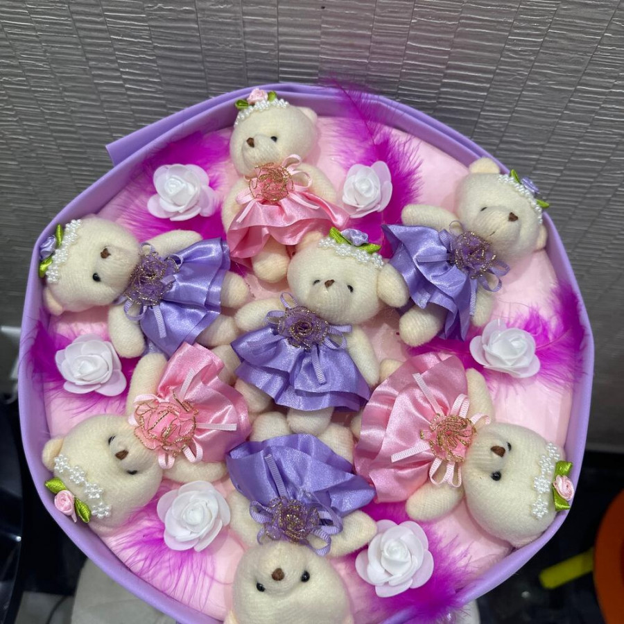 На фото мягкий букет принцесс-медвежат. В составе: . Все цветы свежие и ароматные, букет красиво оформлен и отлично подходит для подарка. Доступна доставка цветов или самовывоз.
