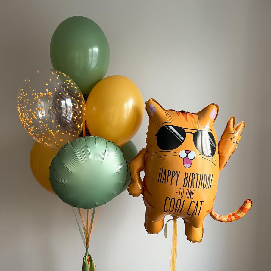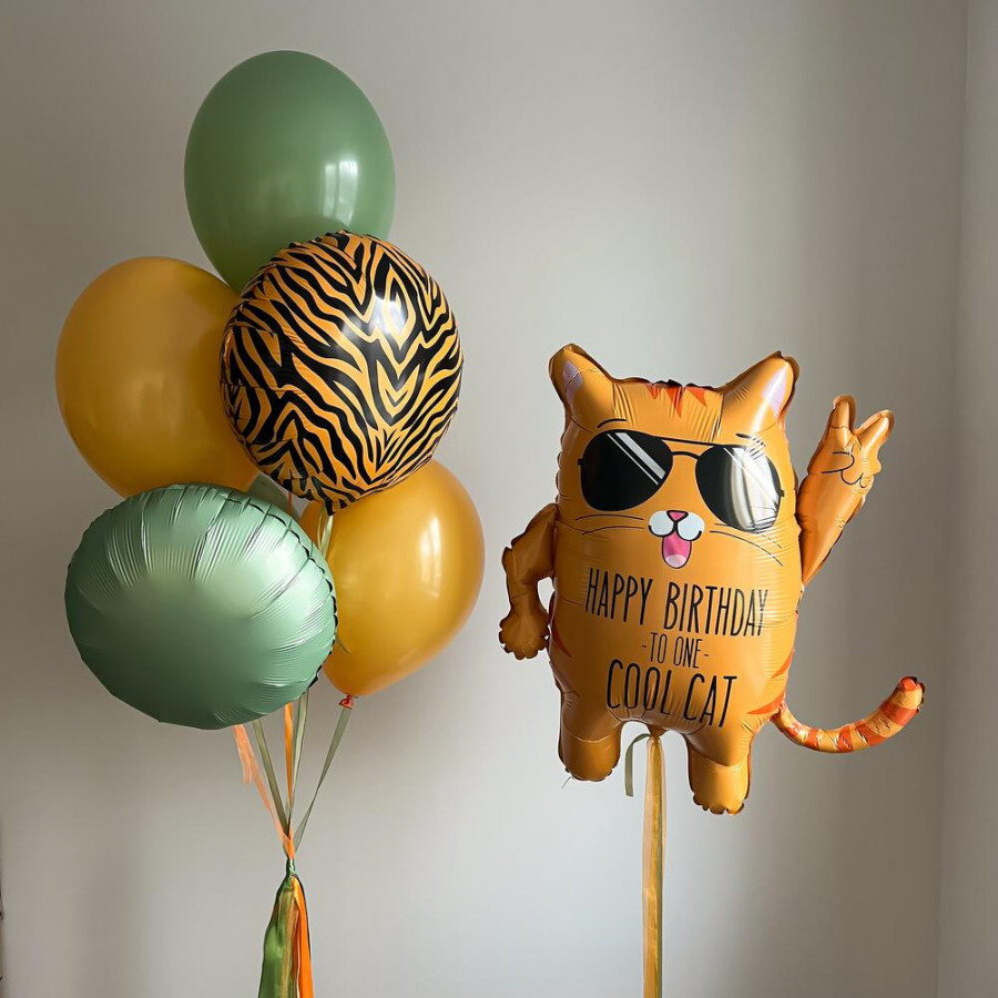 Состав композиции: - фонтан из 4 латексных шариков ( 30 см) , 1 латексный шарик с пенопластом ( 30 см), 2 фольги рванных круга ( 46 см) - фольгированный кот (66 см)